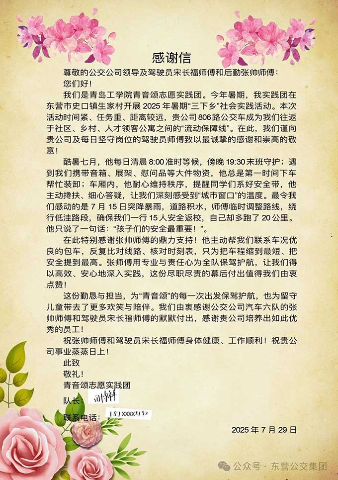 近日,青島工學院青音頌志愿團發(fā)來一封感謝信,感謝東營市公交集團駕駛員宋長福師傅熱情服務(wù)。原來,在今年...